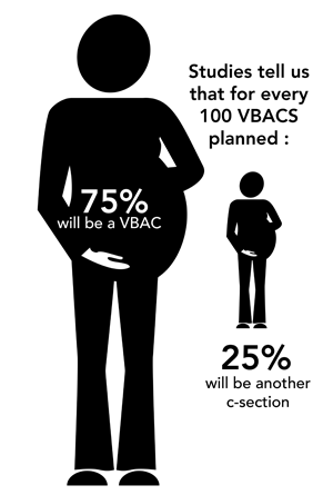 Even if you plan VBAC, you may need to have a C-section. This happens to about 1 in 4 who plan VBAC. Having a C-section after labour has begun is associated with more risks (such as uterine infection) than a C-section before labour.